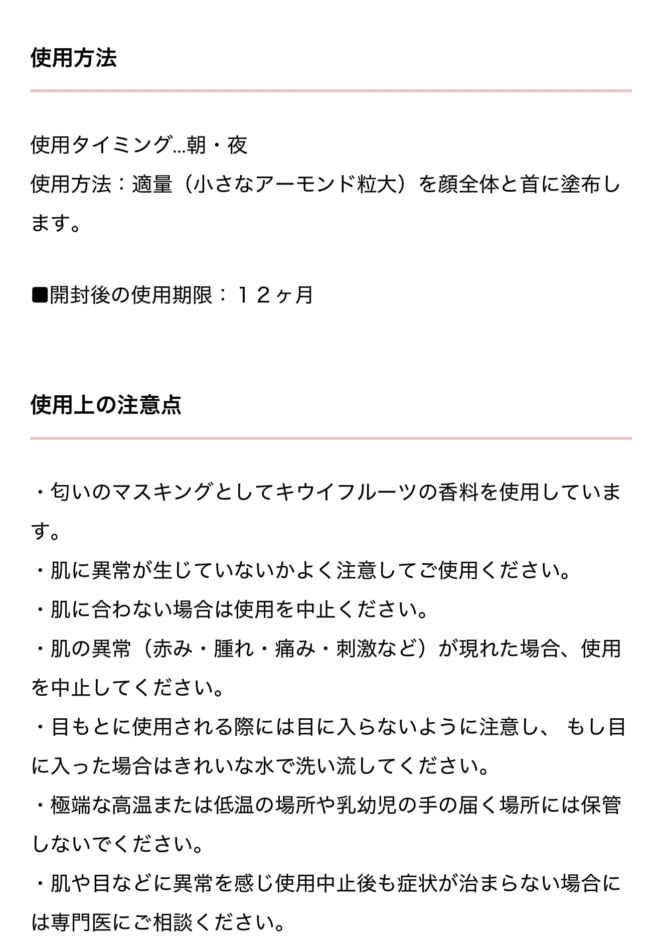 ・朝、夜に適量(小さなアーモンド粒大)を顔全体と首に塗布します。