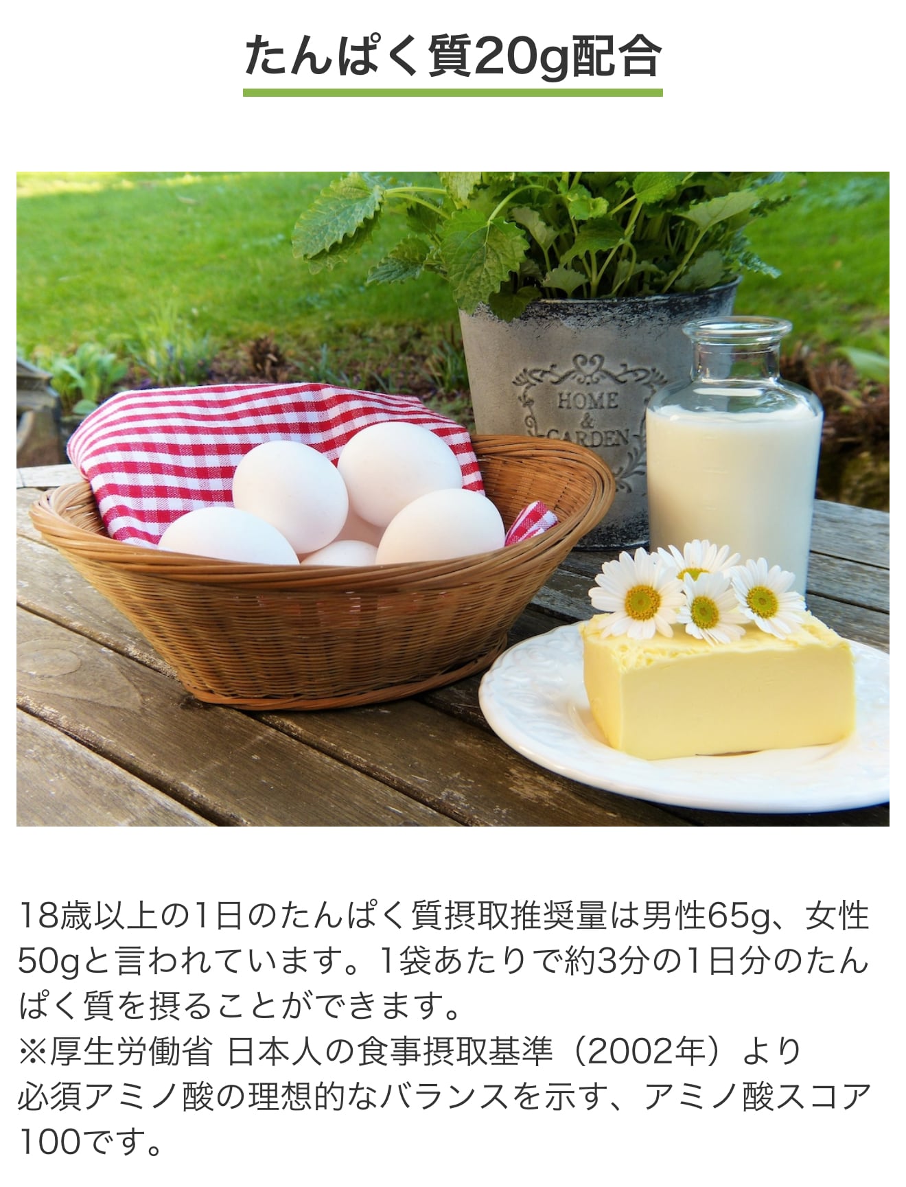 1袋で1食分のたんぱく質(20g)を摂ることができるので、食の細い方やダイエット中の方などの食事の置き換えとしてもおすすめです。