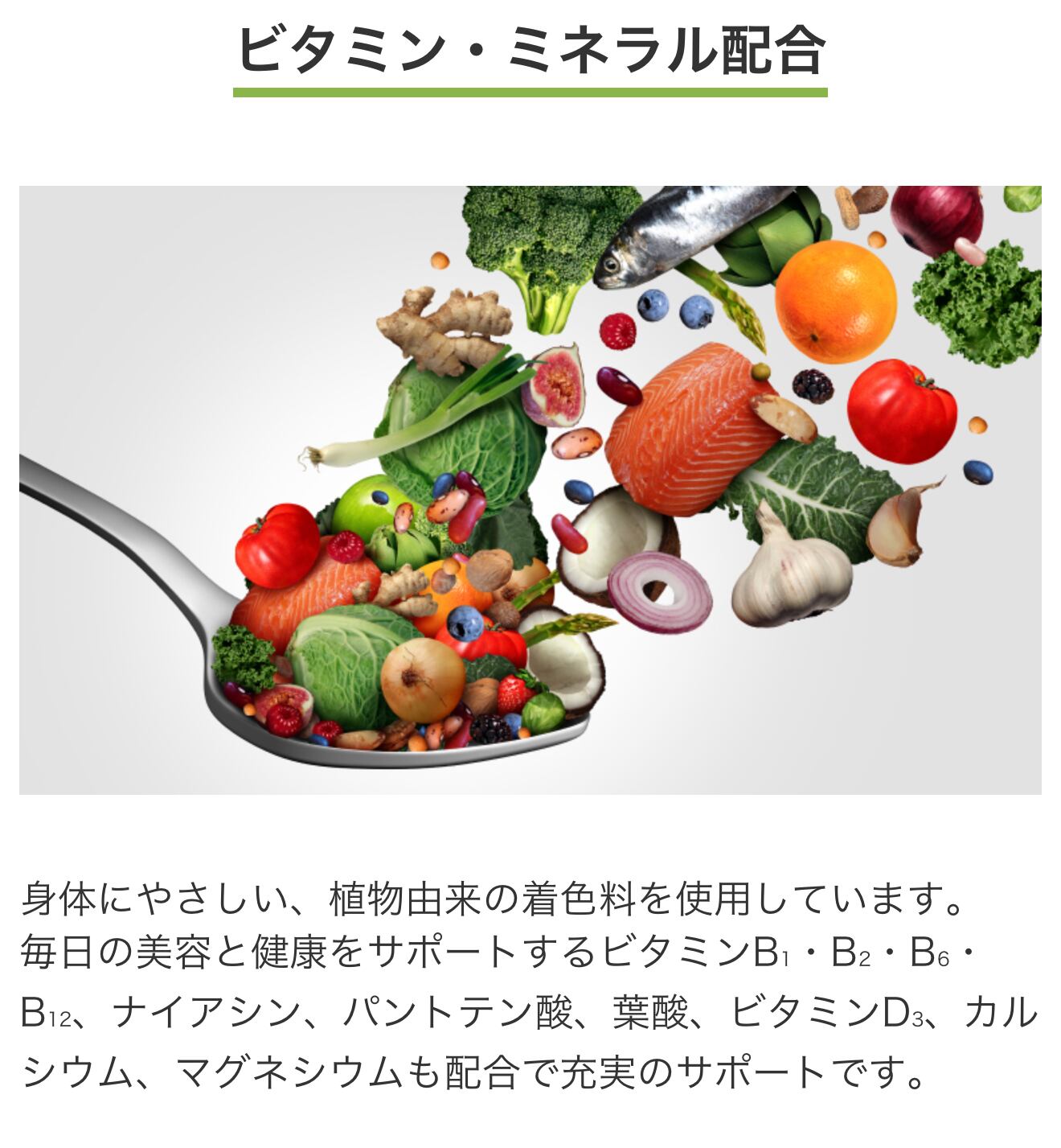 毎日の美容と健康をサポートするビタミンB1・B2・B6・B12、ナイアシン、パントテン酸、葉酸、ビタミンD3、カルシウム、マグネシウムを加えた充実の栄養バランスです。