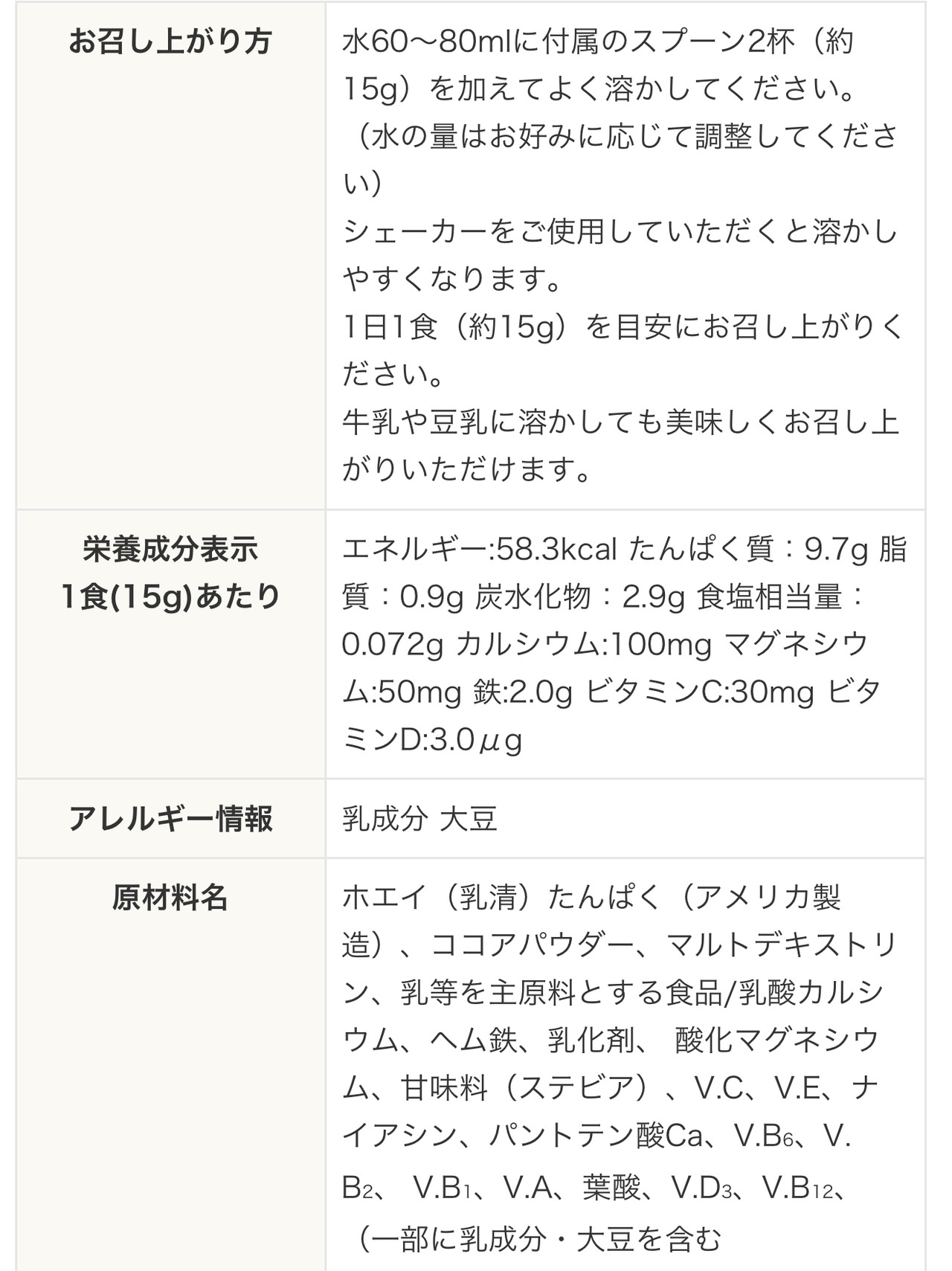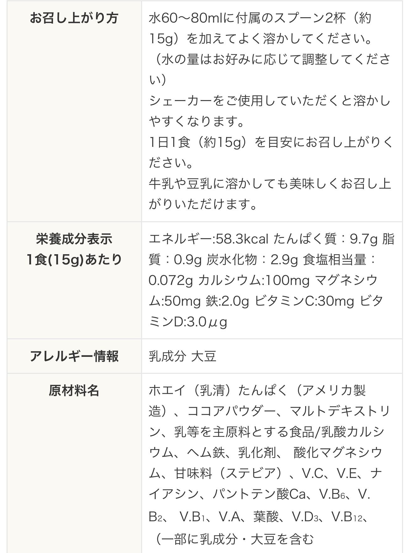 水60~80mlに付属のスプーン2杯(約15g)を加えてよく溶かしてください。