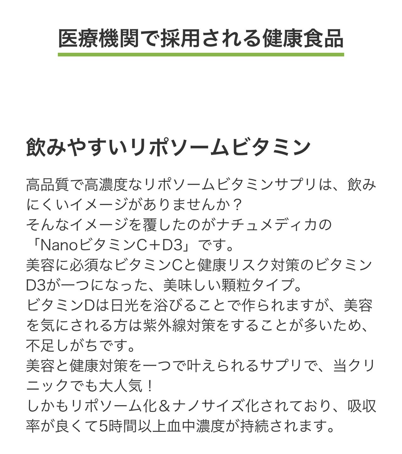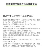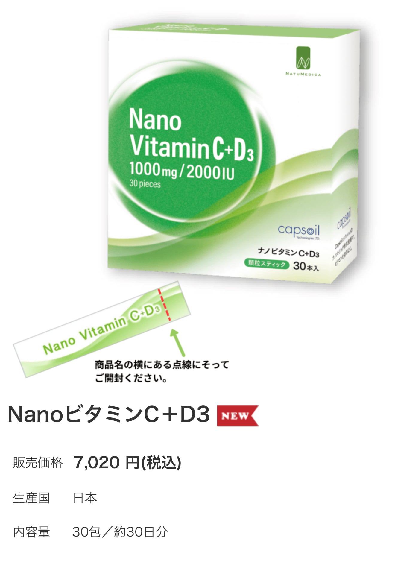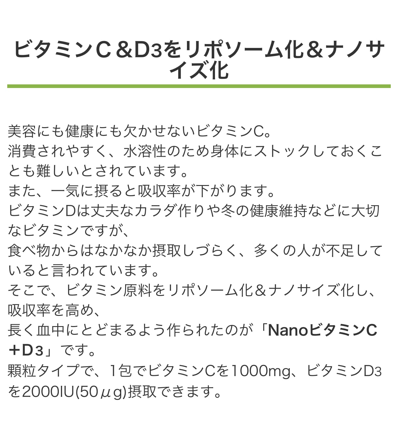 そこで、ビタミン原料をリポソーム化&ナノサイズ化し、吸収率を高め、長く血中に残るように作られたのが「ナノビタミンC+D3」です。顆粒タイプで、1包でビタミンCを1000mg、ビタミンD3を2000IU(50μg)摂取できます。