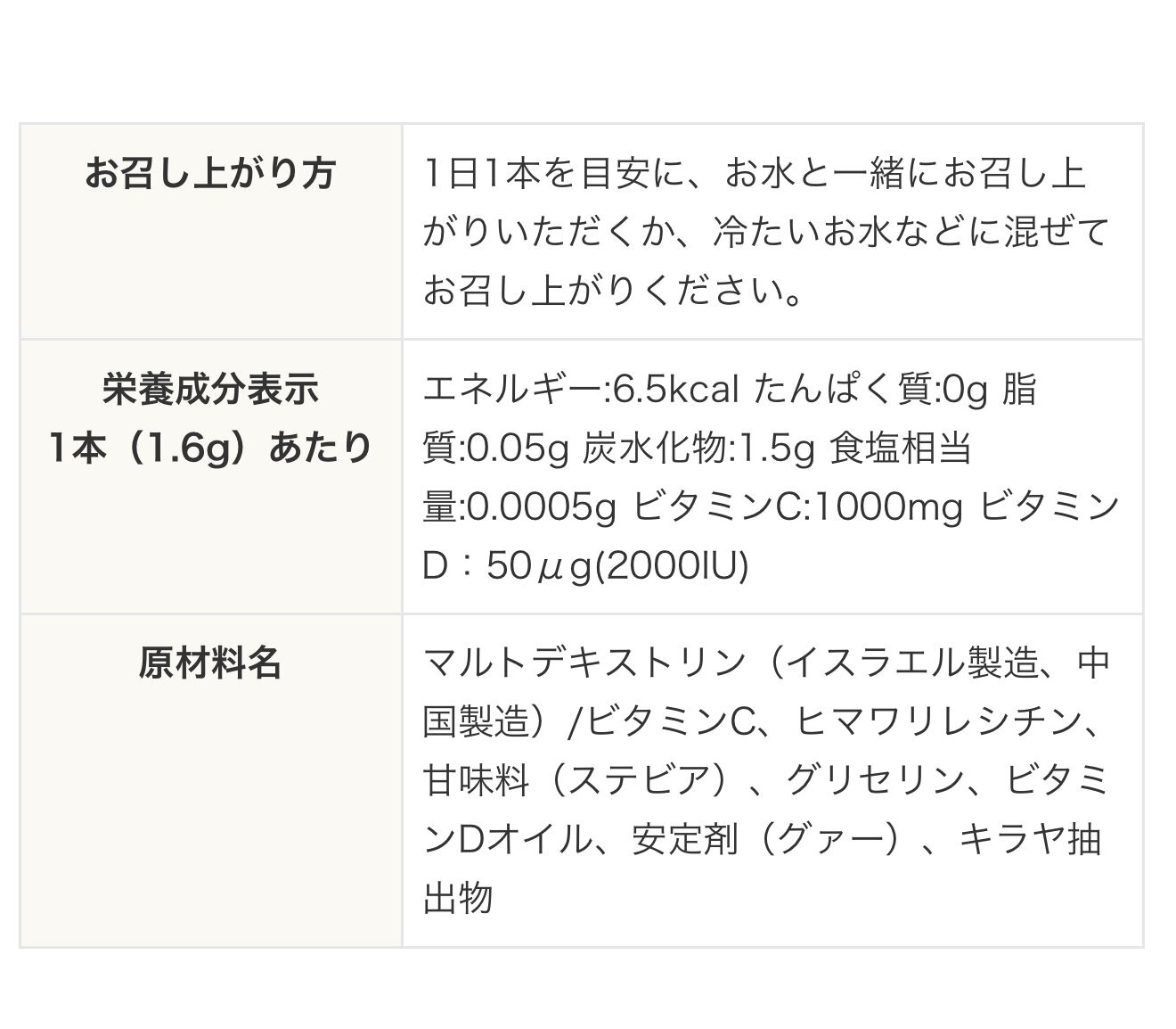 ※全ての方にアレルギーなどが起きないとは限りません。たんぱく質:0g 脂質:0.05g 炭水化物:1.5g 食塩相当量:0.0005g ビタミンC:1000mg 【原材料名】マルトデキストリン(イスラエル製造、中国製造)/ビタミンC、ヒマワリレシチン、甘味料(ステビア)、グリセリン、ビタミンDオイル、安定剤(グァー)、キラヤ抽出物