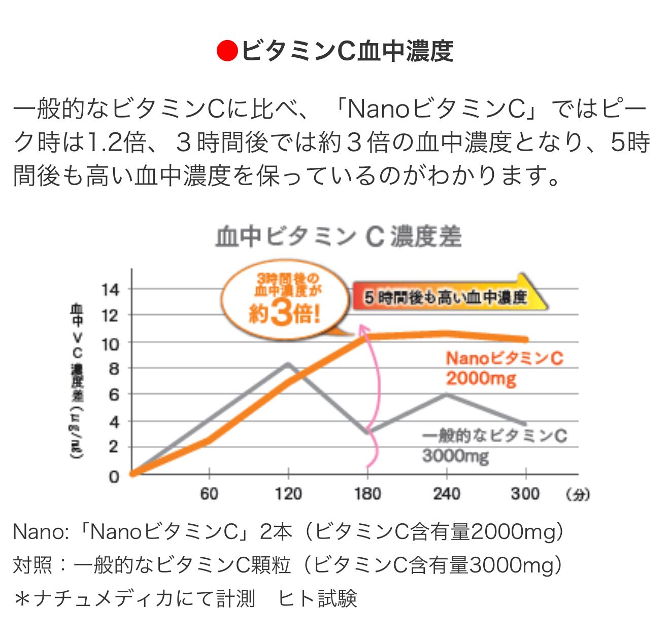 一般的なビタミンCに比べて、「NanoビタミンC」ではピーク時は1.2倍、3時間後では約3倍の血中濃度となり、5時間後も高い血中濃度を保っているのが