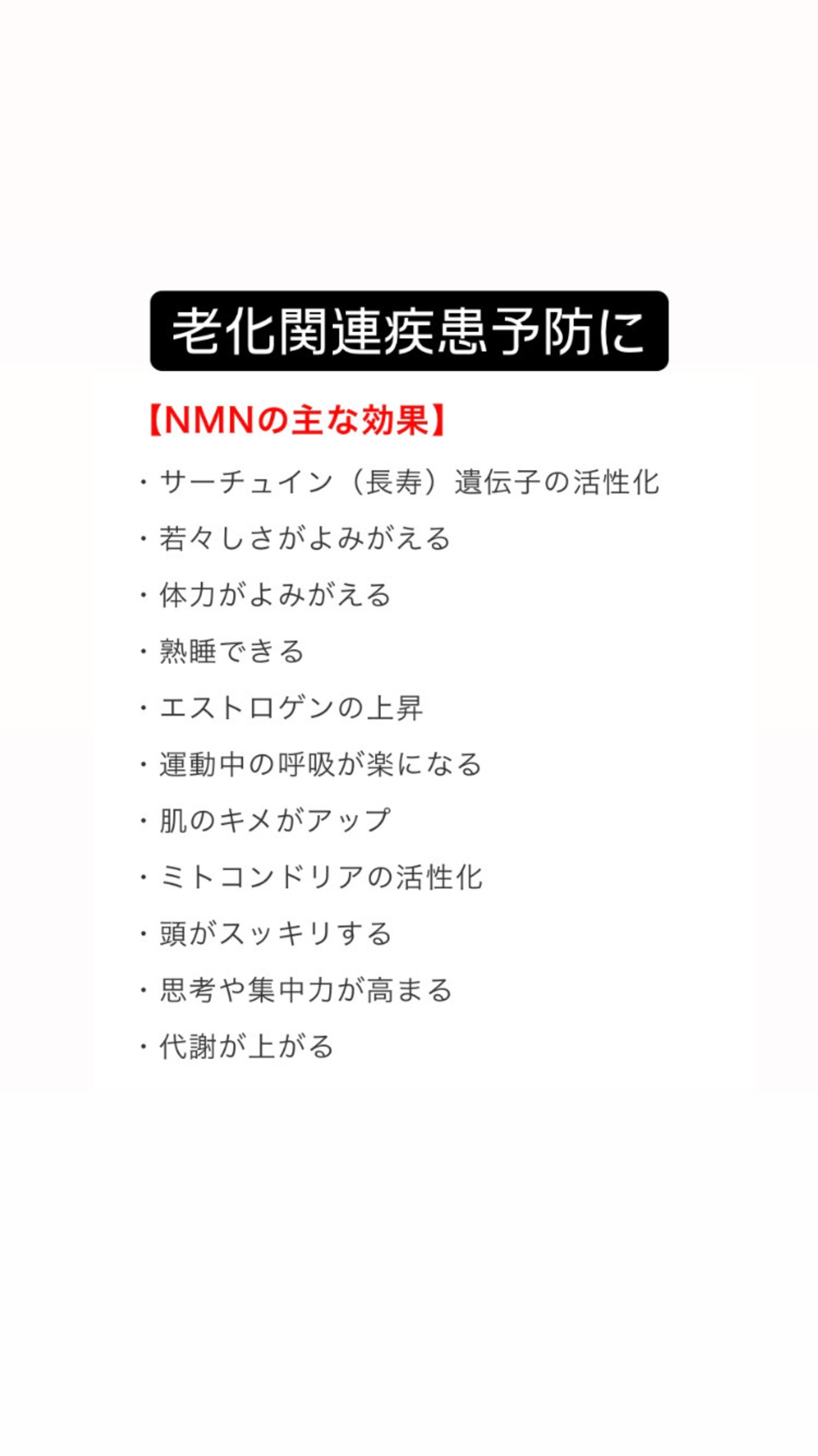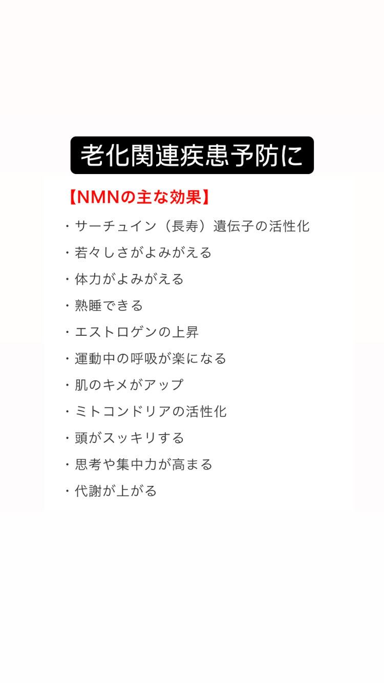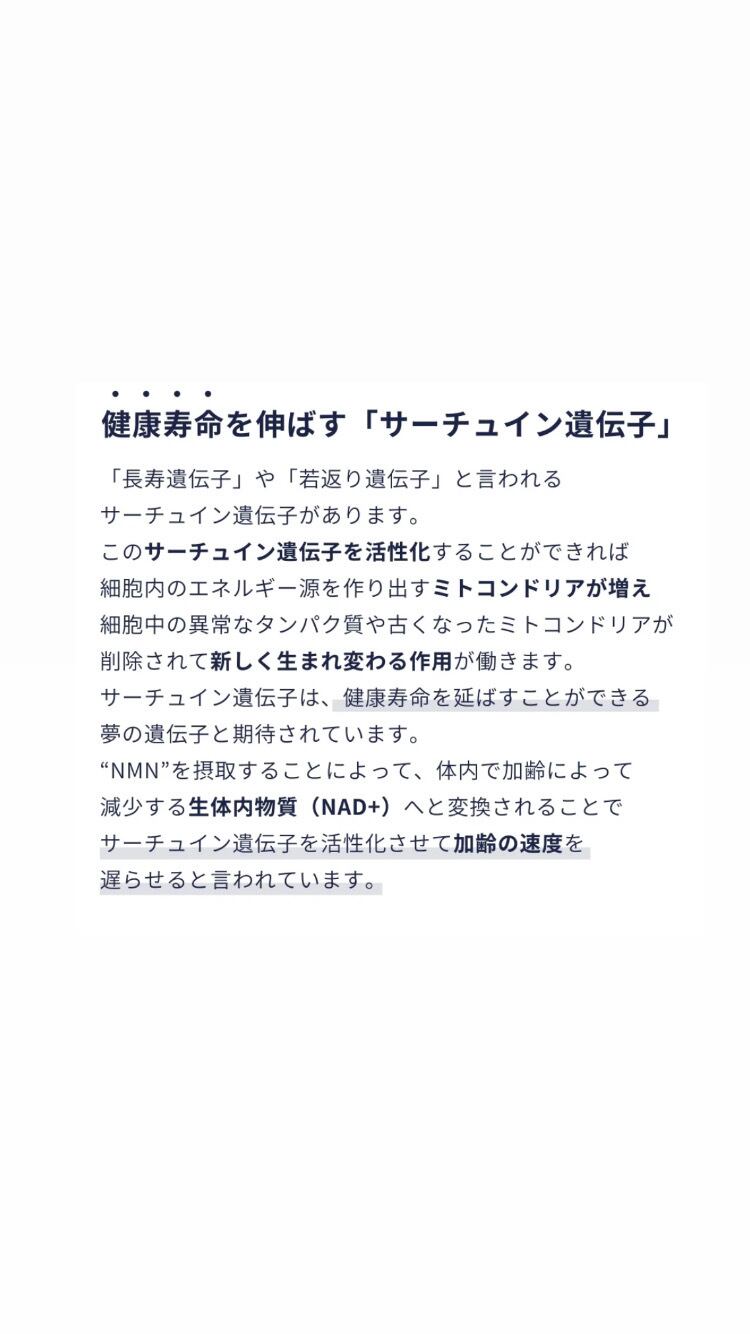 NMNは摂取後、NAD(ニコチンアミド・アデニン ・ジヌクレオチド)という補酵素に変換されて、サーチュイン(長寿遺伝子) が活性化されることが知られています。