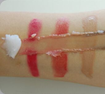 スパチュラで約2g(さくらんぼ大)を取り、手のひらで軽く伸ばします。